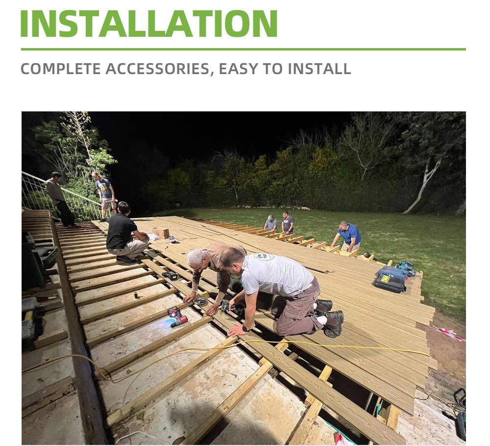 Uzstādīšana ir vienkārša, izmantojot mūsu klāja modulāro wpc. Dēļi ir viegli un viegli apstrādājami, un tos var sagriezt un veidot, lai tie atbilstu jebkuram klāja izkārtojumam. Bloķēšanas sistēma nodrošina drošu un stabilu piegulšanu, samazinot vajadzību pēc papildu stiprinājumiem un samazinot deformācijas vai sadalīšanās risku. Tas padara to par ideālu izvēli gan DIY entuziastiem, gan profesionāliem uzstādītājiem.